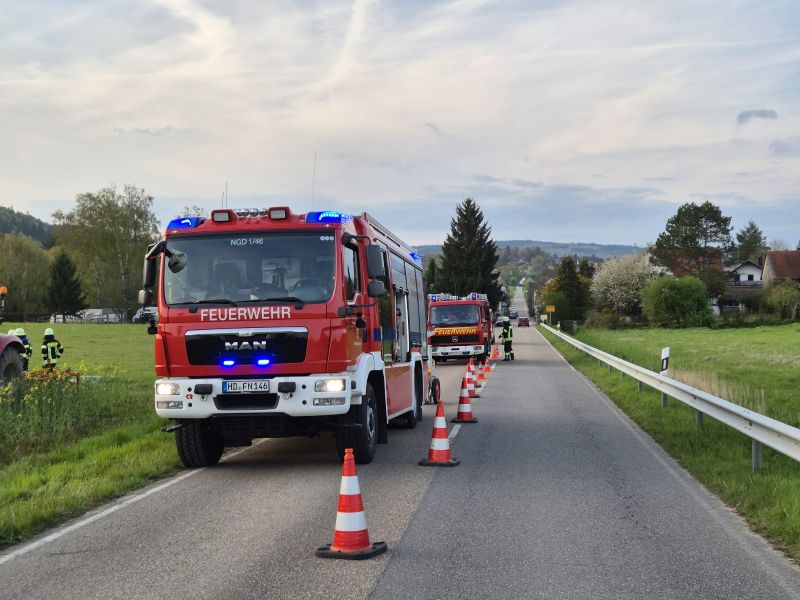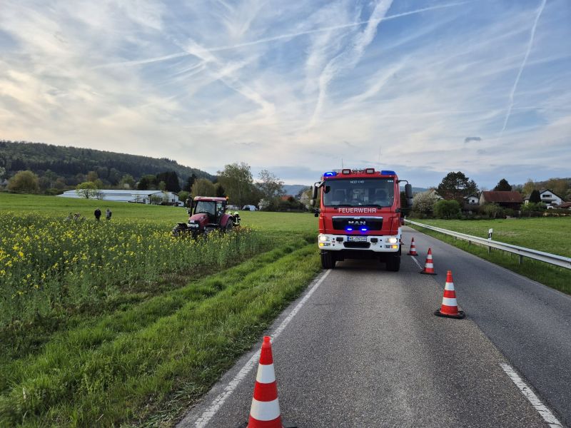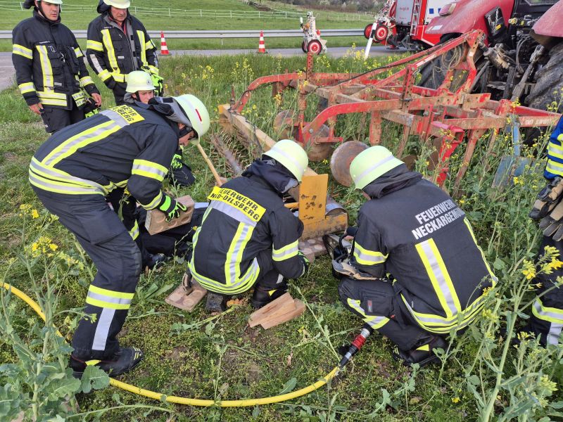 Ein Traktor hatte beim Rückwärtsfahren eine Person übersehen und diese geriet unter das angehängte Anbaugeräte. Die Person wurde mittels verschiedenen technischen Möglichkeiten aus der misslichen Lage befreit. Hierbei gilt der Dank Georg Mayer, welcher den Traktor zur Verfügung gestellt hat.