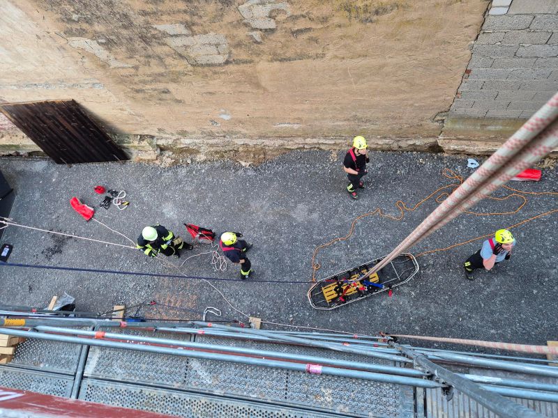Unsere Gruppe Absturzsicherung hatte die Aufgabe zusammen mit zwei Kamerad*innen aus der Abt. Stadt eine verletzte Person von einem Baugerüst mittels Flaschenzug und Schleifkorbtrage zu retten.