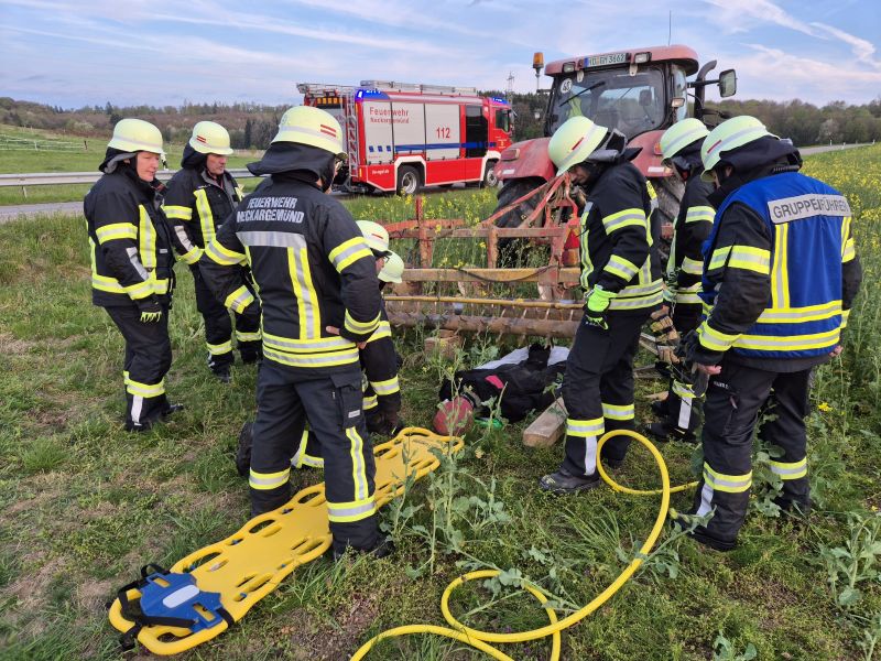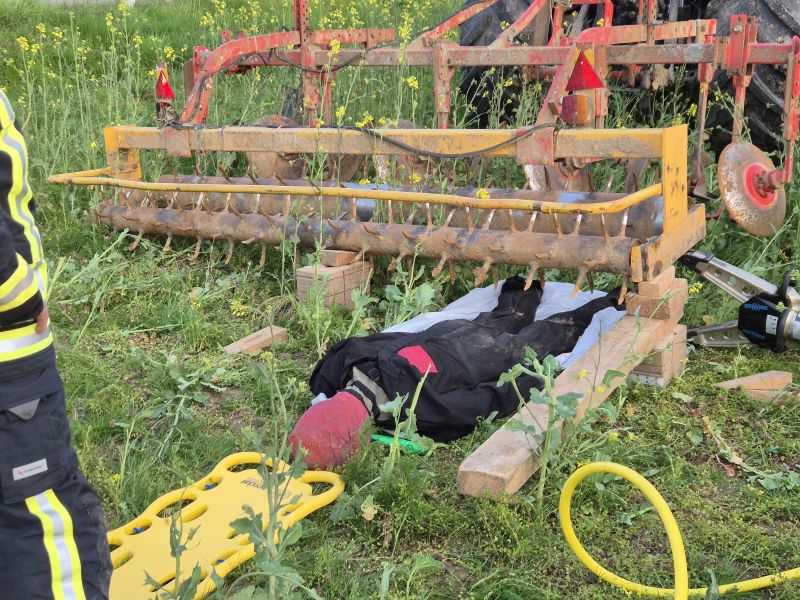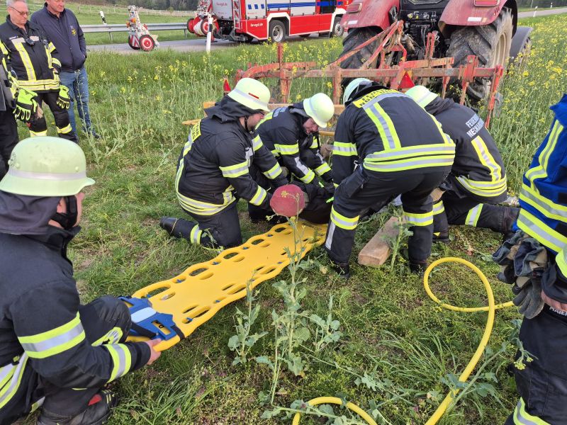 Ein Traktor hatte beim Rückwärtsfahren eine Person übersehen und diese geriet unter das angehängte Anbaugeräte. Die Person wurde mittels verschiedenen technischen Möglichkeiten aus der misslichen Lage befreit. Hierbei gilt der Dank Georg Mayer, welcher den Traktor zur Verfügung gestellt hat.