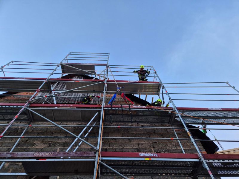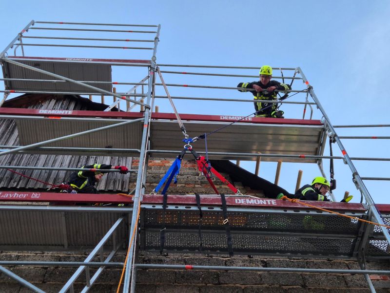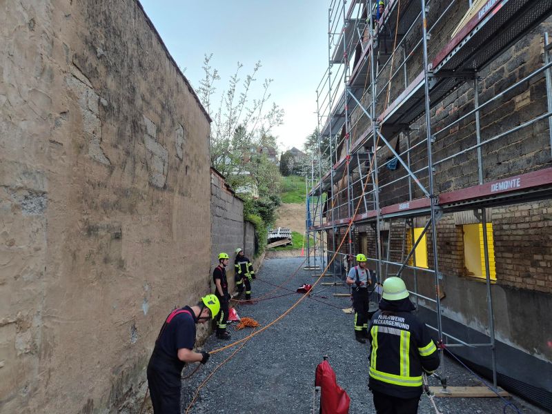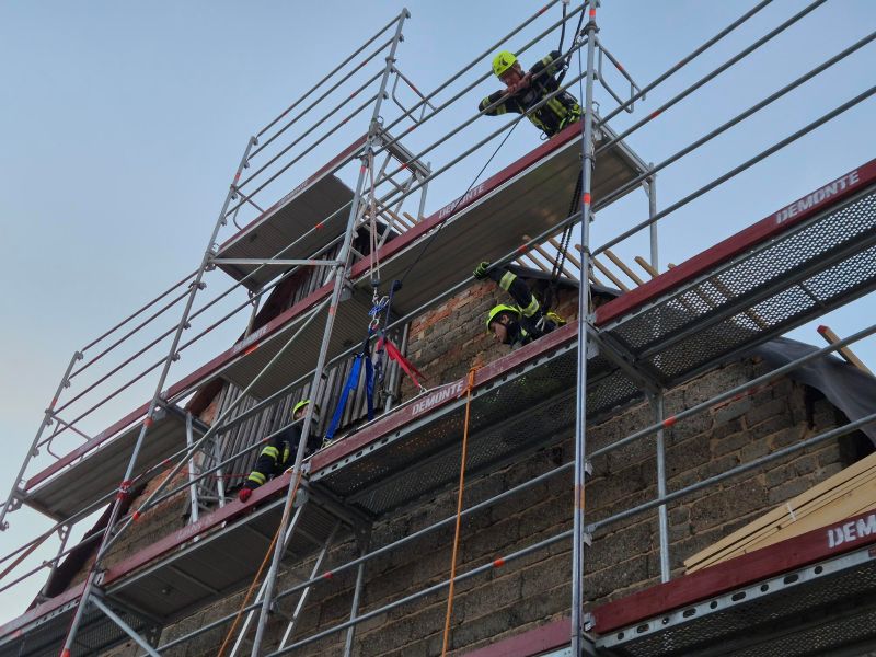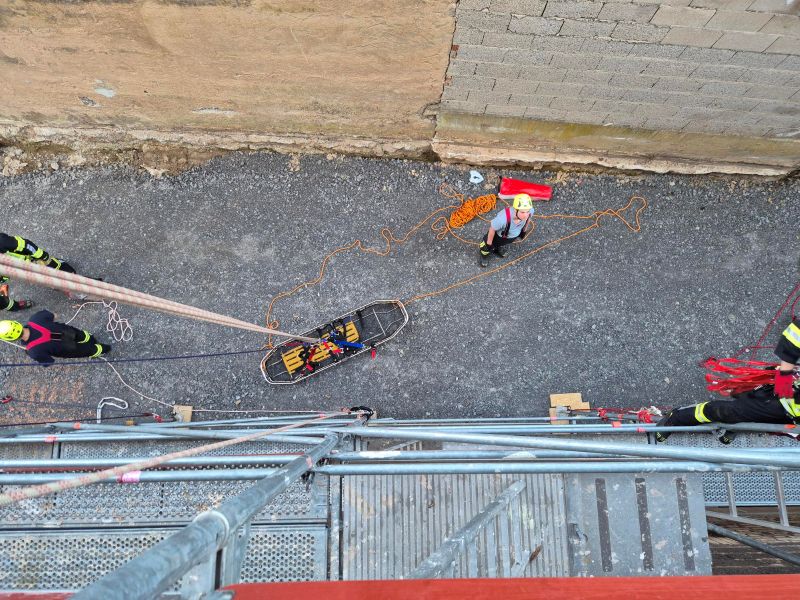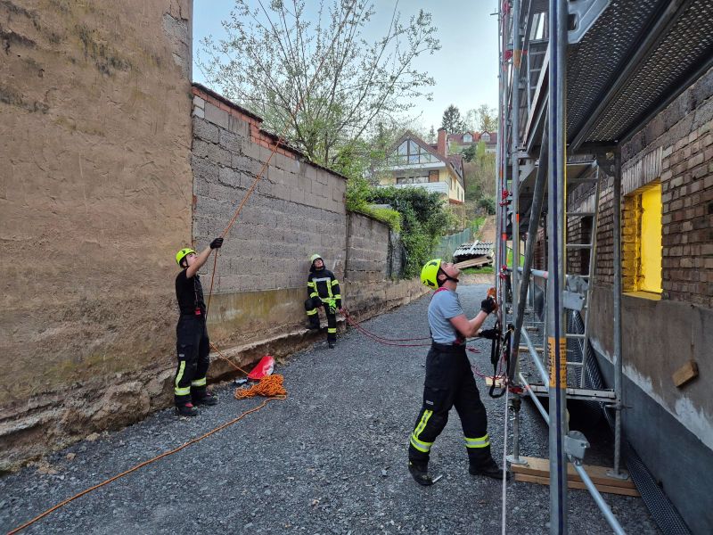 Unsere Gruppe Absturzsicherung hatte die Aufgabe zusammen mit zwei Kamerad*innen aus der Abt. Stadt eine verletzte Person von einem Baugerüst mittels Flaschenzug und Schleifkorbtrage zu retten.